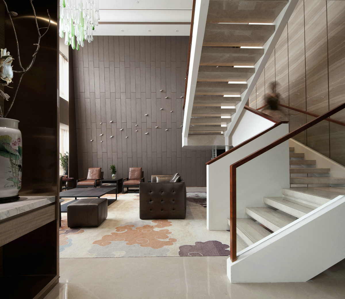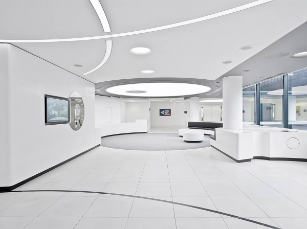 4300平米醫(yī)療公司辦公空間設(shè)計布局,平靜的色彩、柔軟的面料和以類似色調(diào)選擇的彎曲形式提供了所需的寬敞和平靜的氛圍。彎曲的墻壁從入口連續(xù)延伸,增強了空間的連續(xù)性,并通過在墻壁內(nèi)創(chuàng)建的彩色壁龕創(chuàng)建了咖啡店區(qū)域等功能區(qū)域。